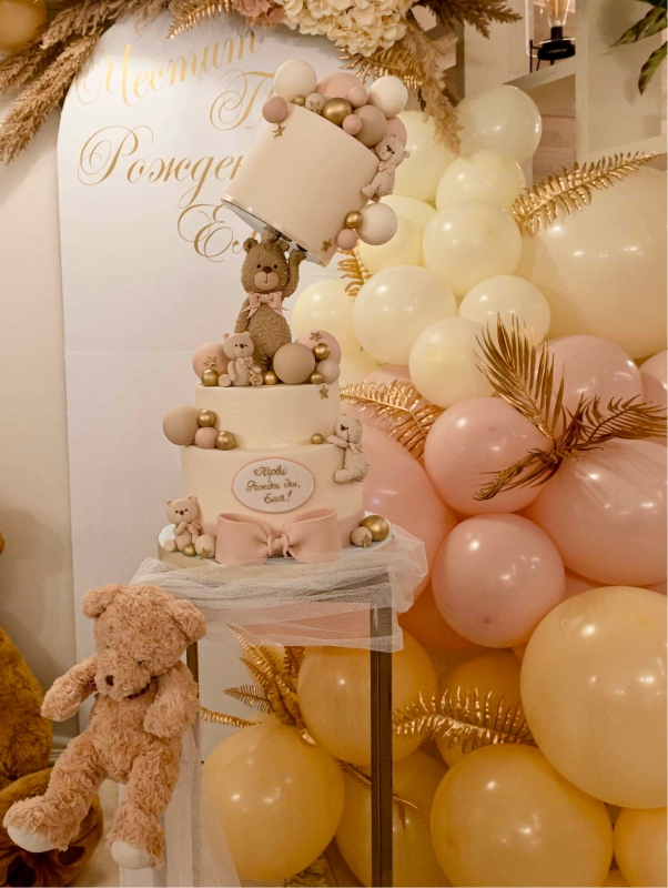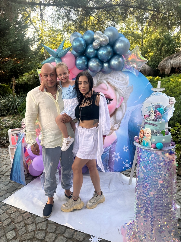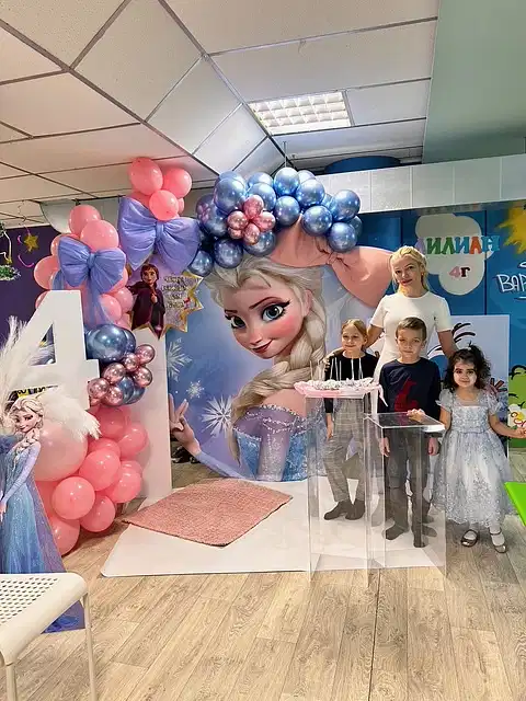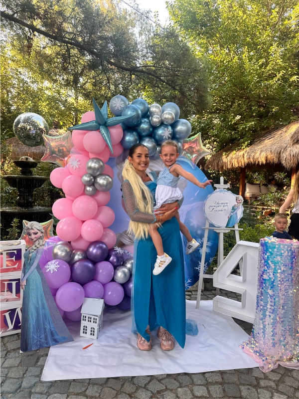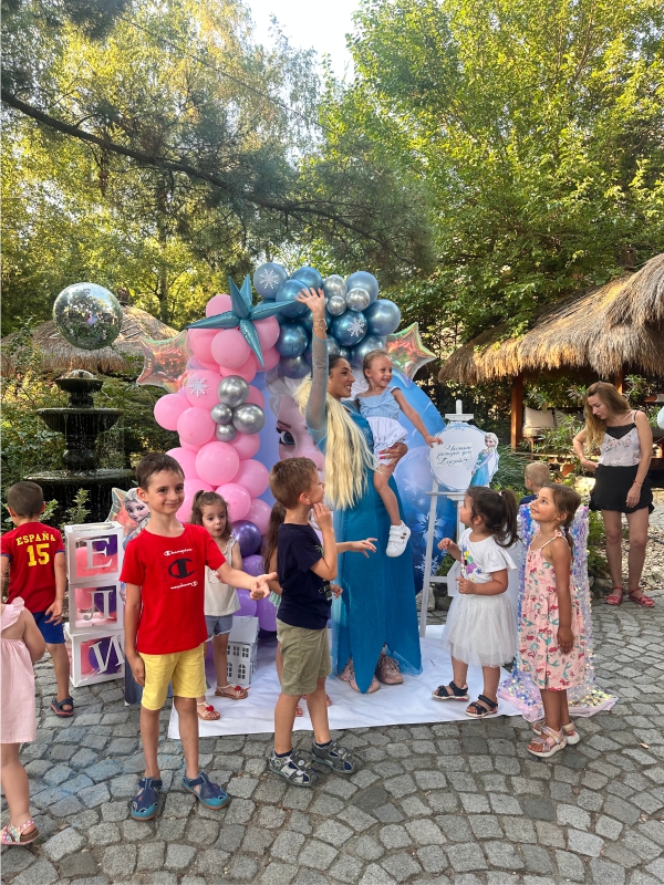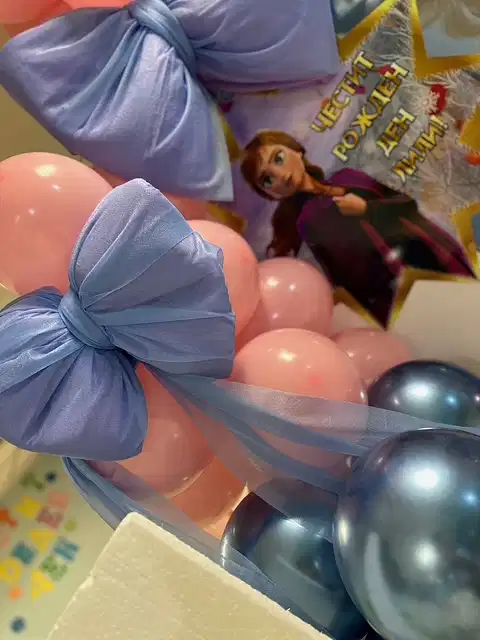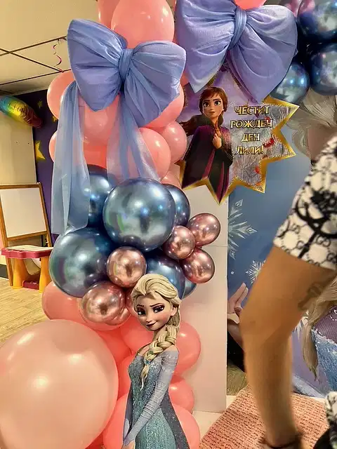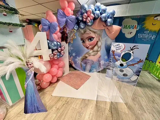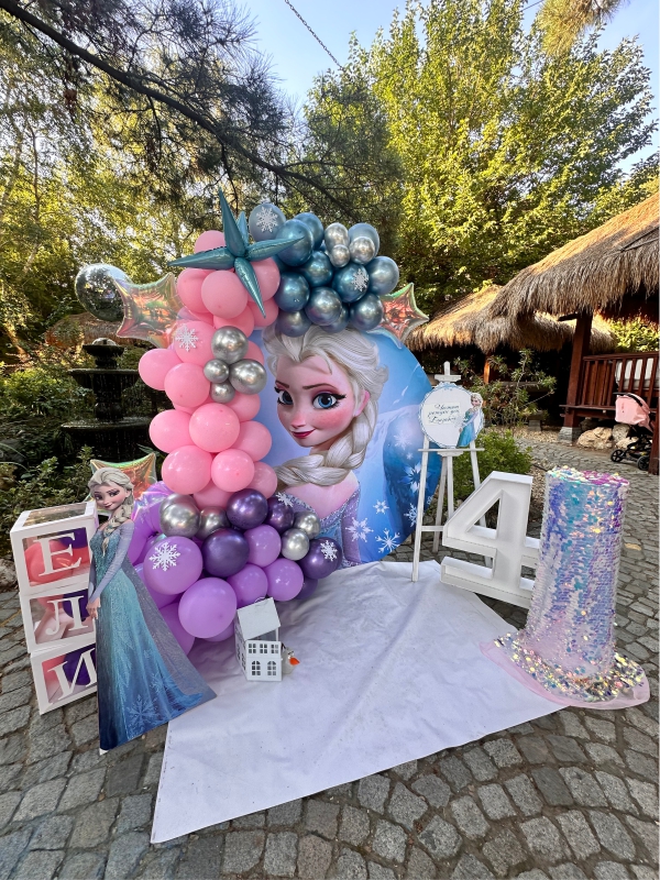 Рожден ден на Елизабет с любимите Елза и Ана от Леденото кралство. Декорация с голям банер, банер с името на детето, кубчета с балони, стойка за торта, голяма обемна цифра и много настроение!