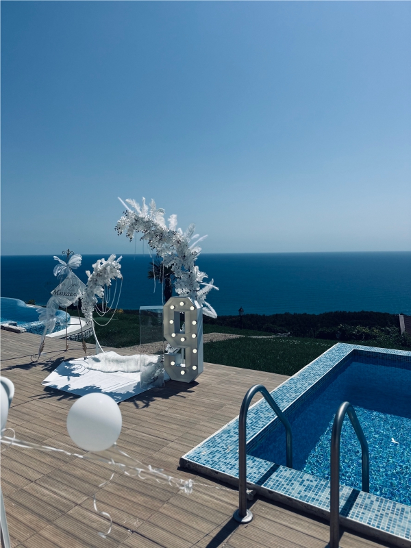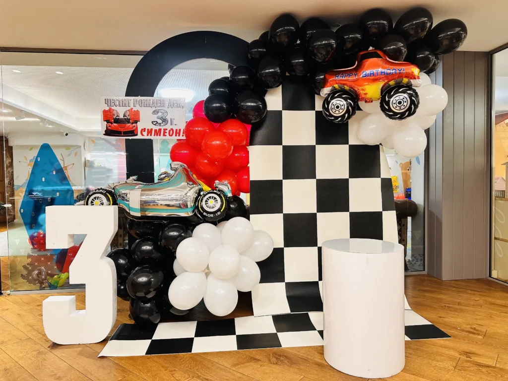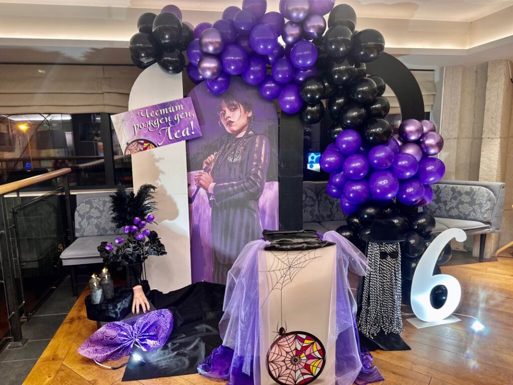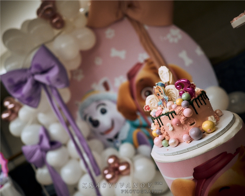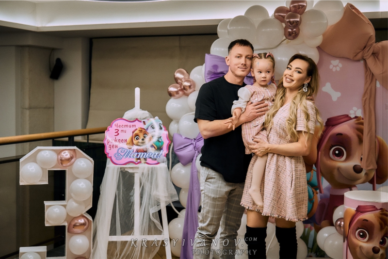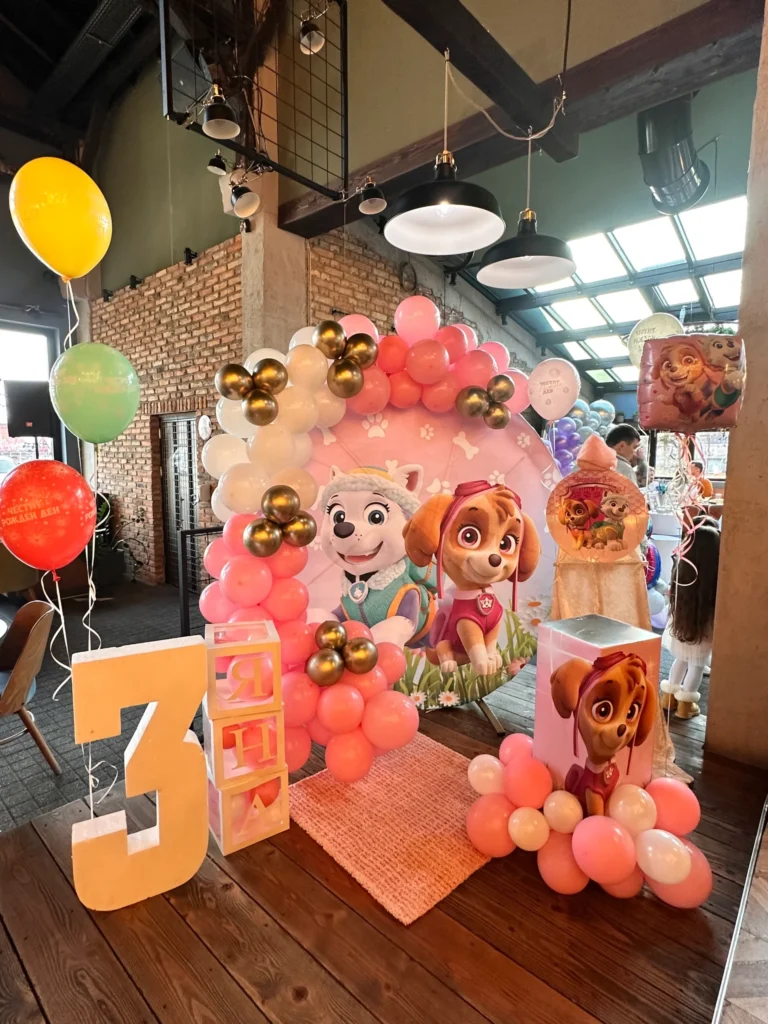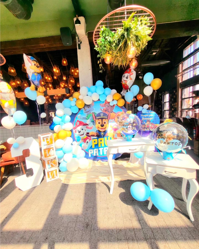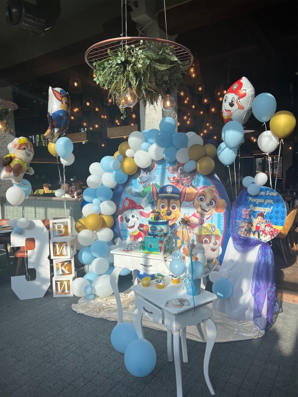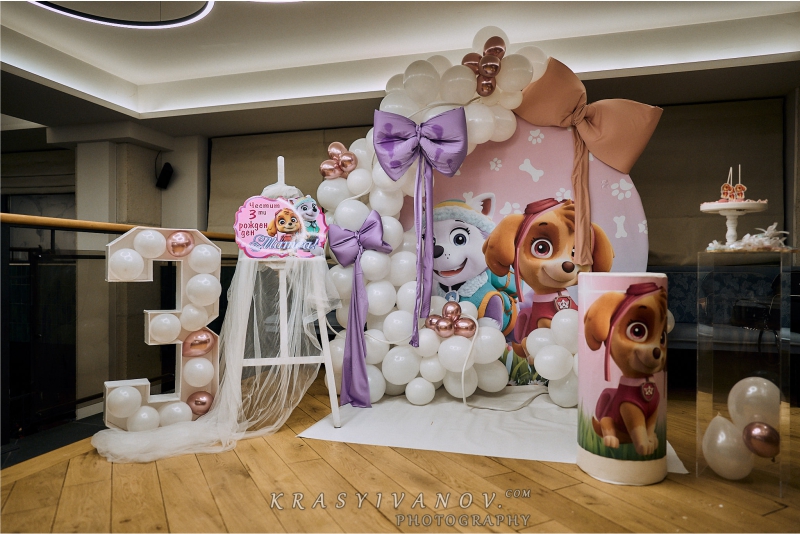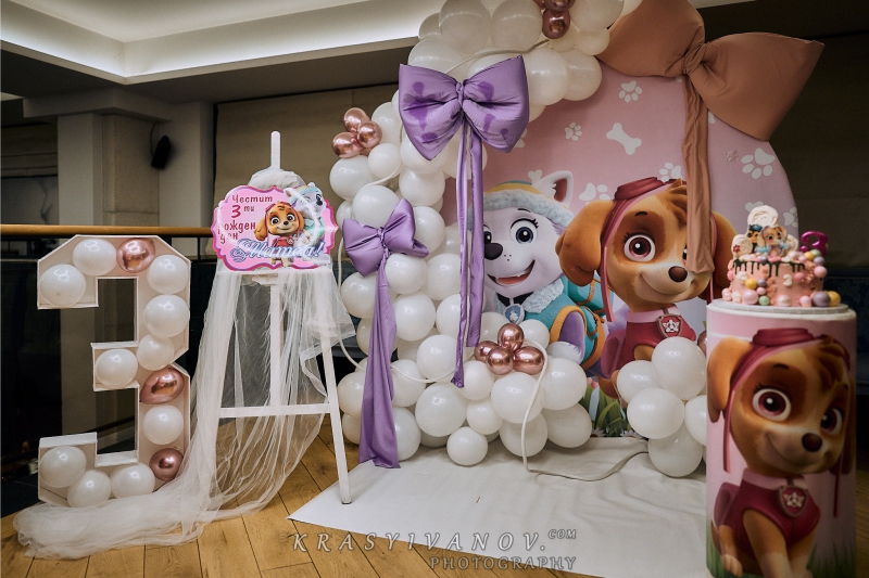 Рожденния ден на малката Матеа с нейния любим Пес Патрул. Декорацията включва банер с името на детето, обемна цифра с балони, стойка за торта и мнооого балони.